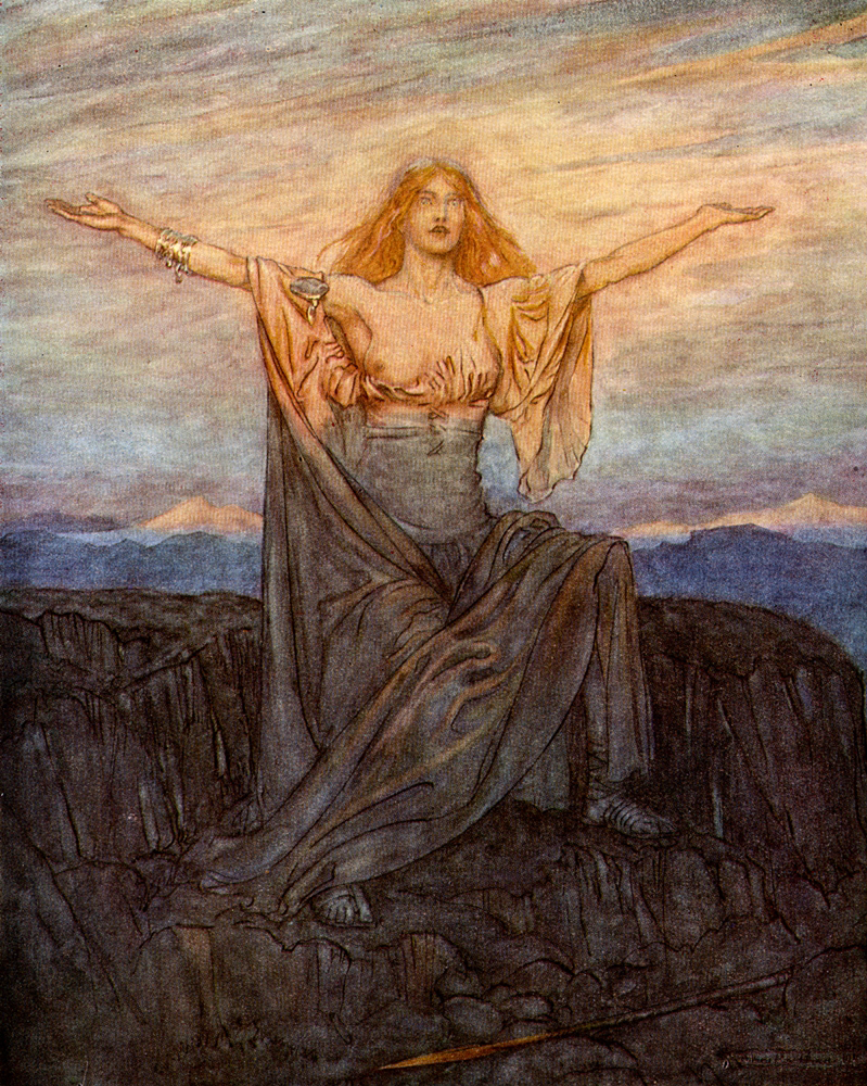 Brūnnhilde wakening and greeting the sun (Siegfried) by Arthur Rackham (1867-1939).
